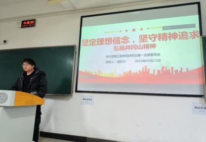 首先,研究生学生第一党支部书记湛旺兴为支部全体党员上了新学期第一堂主题党课:坚定理想信念,弘扬井冈山精神,分别介绍了井冈山精神的产生、基本内涵和现实意义。